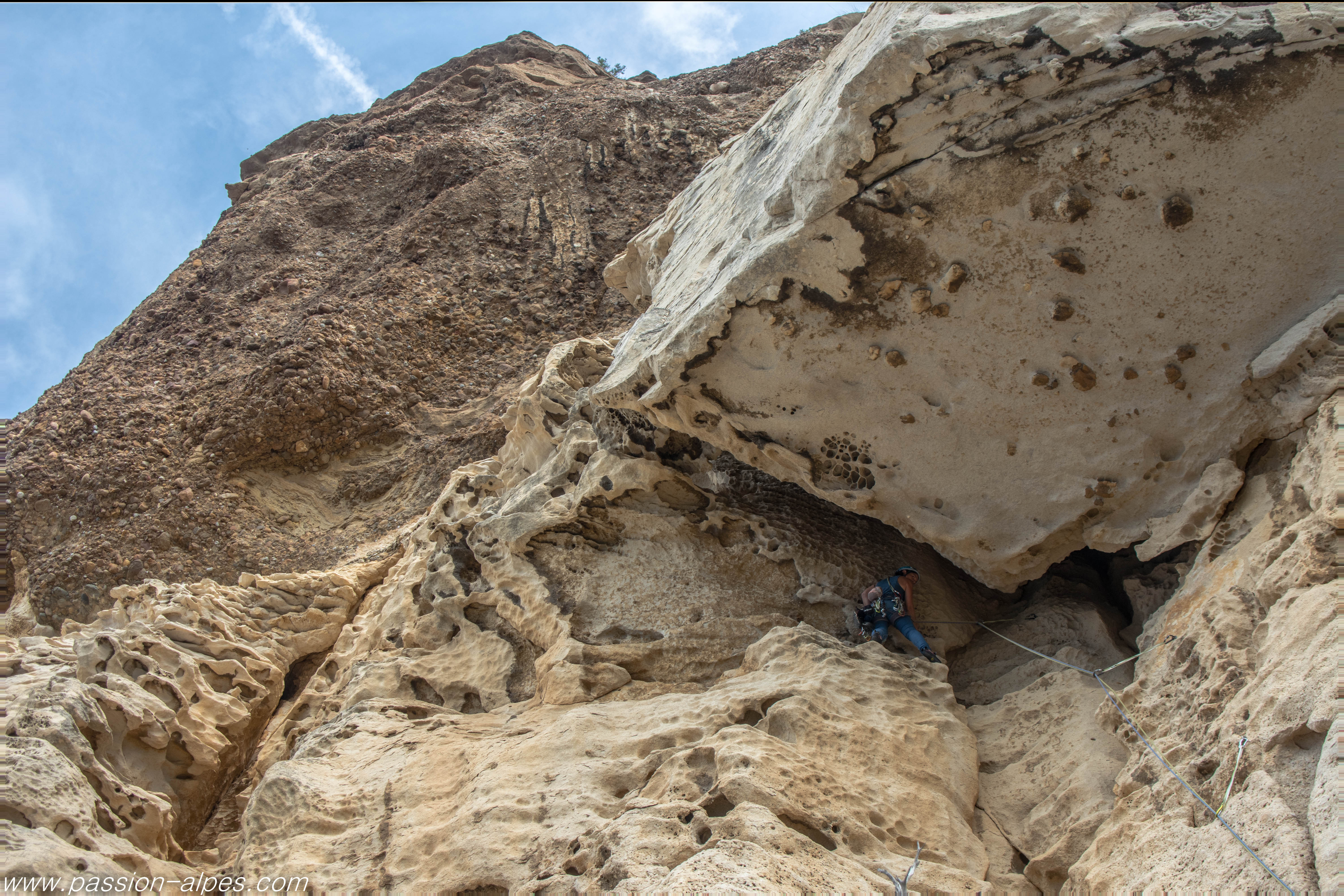 La longueur suivante parcourt de nouveau un mur blanc technique en fissure, avant d’aller franchir un toit massif. Cette fois le passage est carrément génial et ludique, puisqu’il s’agit de se glisser dans une faille en écart pour passer à travers le toit, une très belle « renfougne » comme on dit dans le jargon… On sort alors du toit qui devient croulant pour parcourir de beaux reliefs et faire relais juste au dessus de l’édifice, qu’on imagine assez bien s’écrouler un jour ou l’autre… Ce sentiment de fragilité est d’ailleurs renforcé par l’arrivée dans la zone de pouding, un conglomérat de gros galets enchâssés dans du rocher fragile. C’est l’ambiance particulière de Canaille !