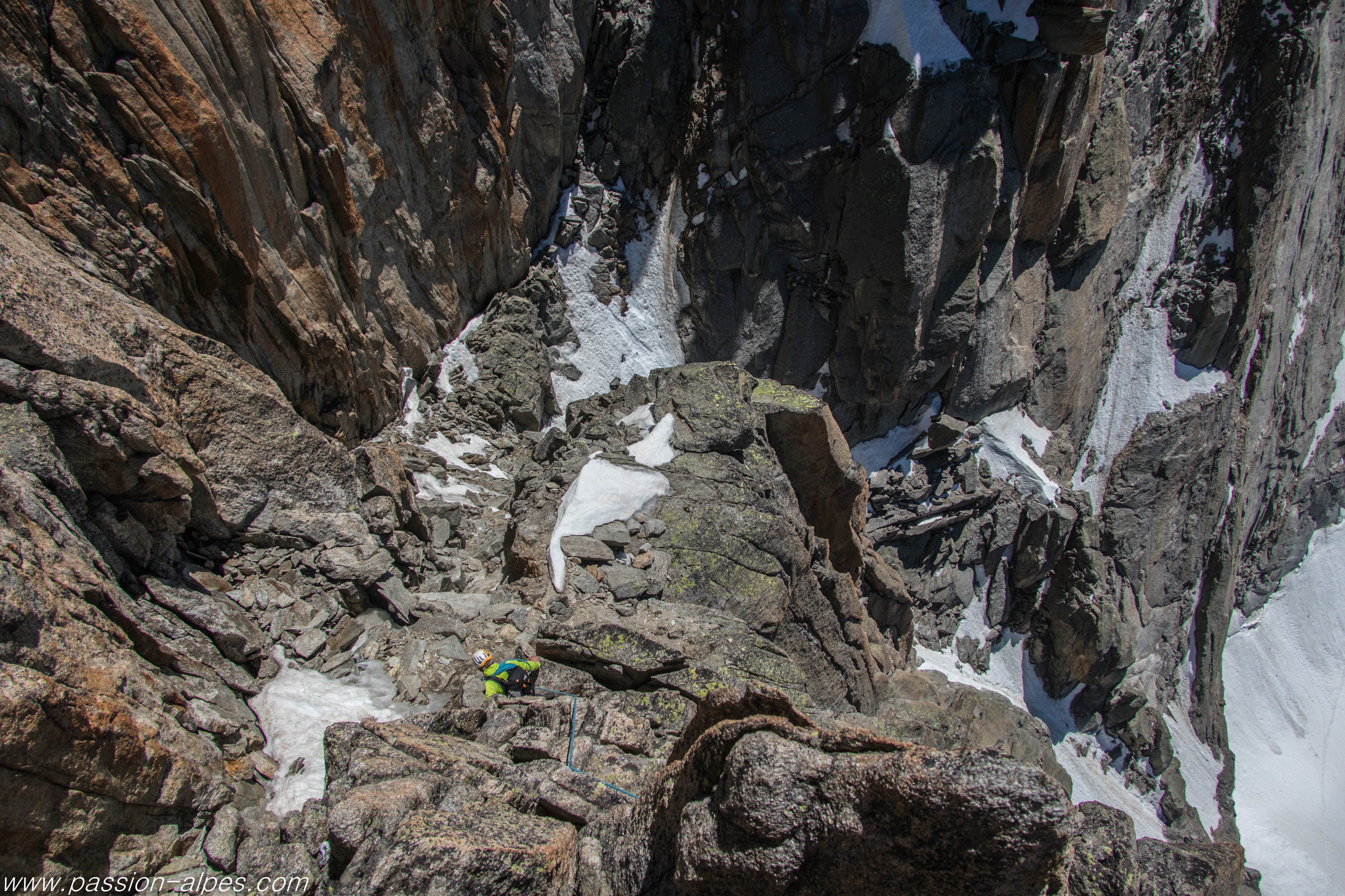 Deux rappels au » Bâton Wicks » nous déposent dans des gradins et sonnent la fin des difficultés dans les Charmoz. On gagne rapidement la brèche Charmoz – Grépon où nous remplissons les gourdes en prévision de notre bivouac (c’est le dernier névé exploitable), et nous repartons vers le gros morceau de cet itinéraire : la fissure Mummery.