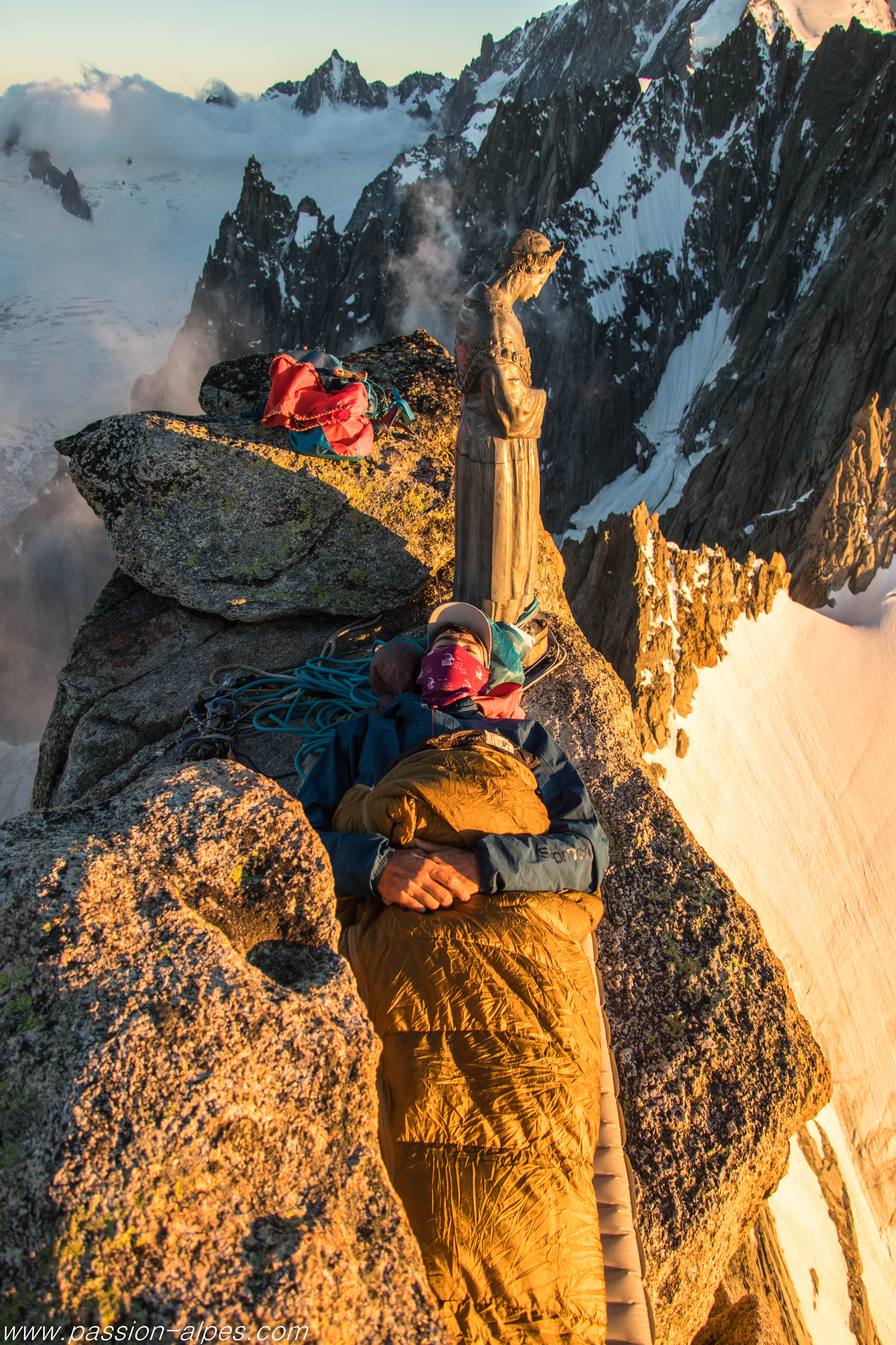 Nous arrivons au sommet 9 heures après notre départ du Plan de l’Aiguille, un horaire idéal qui nous permet de jouir des lieux en toute quiétude, les emplacements de bivouac étant « rares et chers » sur ce sommet (on y case 3 petits gabarits ou deux grands échalas sans choquer la morale, ensuite ce n’est plus » COVID compatible « ). On aère les chaussettes, on attache prudemment tout matériel sorti du sac, et nous installons une ligne de vie le long de l’arête pour passer la nuit en sécurité : le lit est étroit et dépourvu de barreau, bien qu’il soit incliné dans le bon sens.
